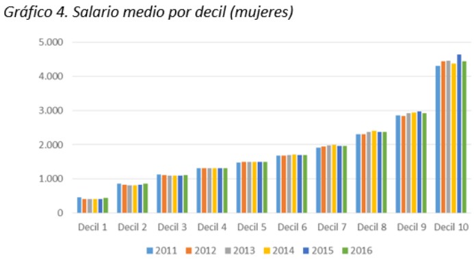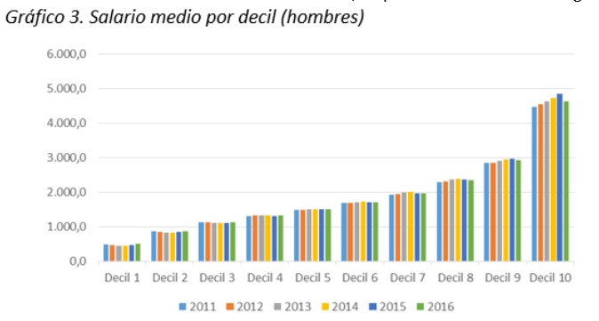 Pese a que el salario medio ha caído entre 2012 y 2015 en los deciles bajos y medios (del 1 al 6), se ve una mejoría en 2016, la cual compensa las caídas de los años anteriores. Por su parte, los deciles más altos (del 7 al 10) se han comportado al revés: ha crecido el salario medio entre 2011 y 2015 para, luego, reducirse en 2016, aunque siguen estando por encima del nivel inicial.
