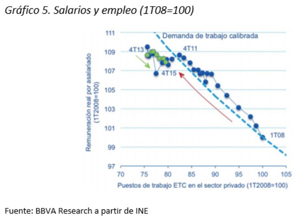 Un análisis de BBVA Research (Los efectos de la flexibilidad salarial sobre el crecimiento y el empleo, 2016) explica que si el comportamiento de los salarios entre 2012 y 2015 hubiese seguido patrones similares a los de 2010-2011 (crecimiento del 4,5% en términos reales),España habría tenido cerca de 1 millón de empleos menos en 2016. Por otro lado, de haberse aplicado una mayor flexibilidad laboral al inicio de la crisis, se habría evitado la destrucción de cerca de 2 millones de ocupados en el largo plazo y la tasa de paro a inicios de 2016 hubiese sido 8 puntos inferior (12,9 % frente al 20,9 % a cierre de 2015).