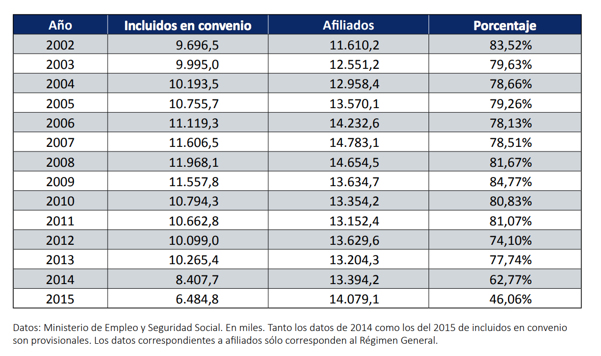 La siguiente tabla pone de manifiesto la profunda transformación que ha supuesto la reforma laboral. De 2002 a 2012, el porcentaje de trabajadores incluidos en un convenio colectivo osciló entre el 78,13% y el 84,77%. No hubo, por tanto, cambios significativos en los años de bonanza, ni en los tiempos de burbuja, ni en los primeros compases de la crisis, ni en los peores momentos de la Gran Recesión.