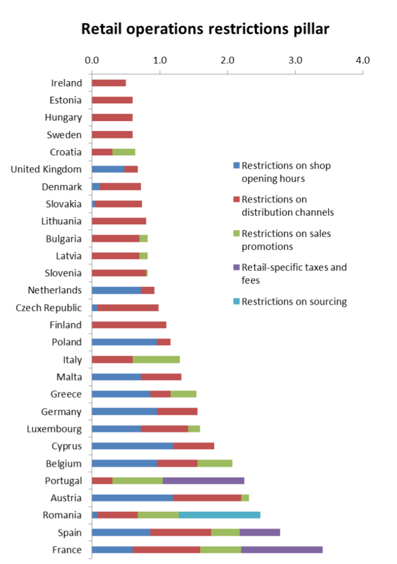 Así pues, tras estudiar estas cinco variables, la Comisión Europea encuentra que Francia y España son los dos países que más difícil se lo ponen a los comercios para funcionar día a día. Las trabas también son elevadas en Rumanía, Austria, Portugal, Bélgica, Chipre, Luxemburgo, Alemania, Grecia, Malta o Italia.