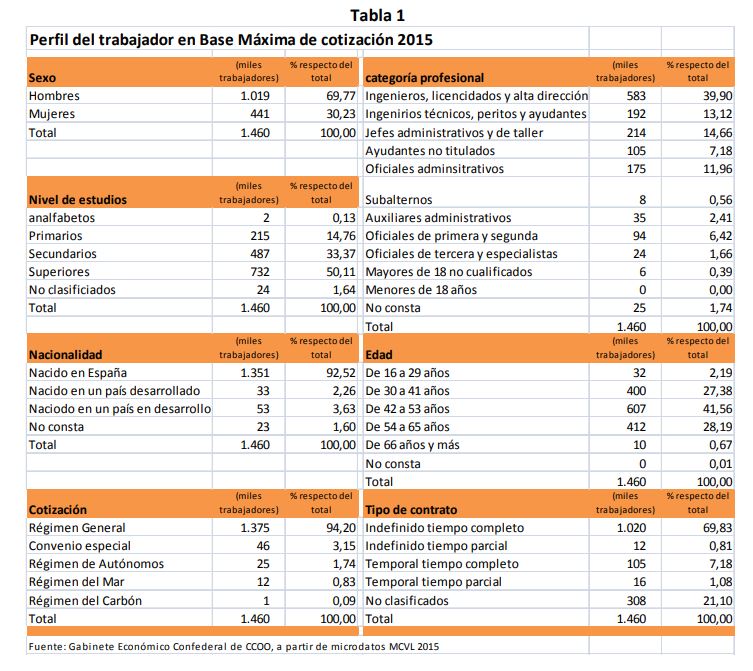 Como decíamos, el número de cotizantes por la base máxima está alrededor de los 1,5 millones de trabajadores. CCOO, con datos de 2015, calcula que son 1.460.000 asalariados. La gran mayoría (1,375 millones) pertenecen al Régimen General y sobre estos haremos las cuentas (ver cuadro de la derecha, click para ampliar). La idea es no distorsionar la comparativa o bien con regímenes en los que la cotización puede estar muy alejada de los ingresos reales (como los autónomos) o con regímenes especiales (convenio especial, agrario, trabajadores del mar, carbón…) en los que puede haber un sesgo hacia arriba o hacia abajo del porcentaje de trabajadores en determinados niveles salariales.