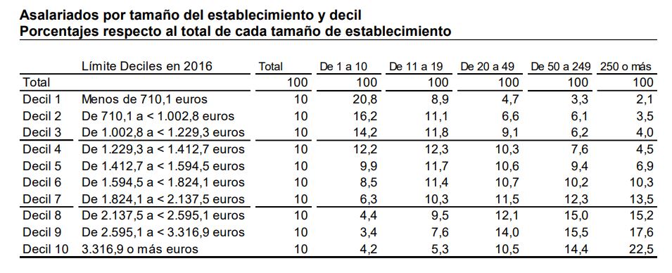 En el Decil de Salarios del Empleo Principal también podemos encontrar datos muy interesantes (eso sí, como en la EES, hablamos de cifras de 2016, las últimas publicadas). Así, el Decil 10 (que recoge al 10% de los asalariados que más gana) comienza en los 3.316,9 euros mensuales o 39.802 al año (de nuevo, hay que recordar que el 10% del que hablábamos antes hacía referencia a cotizantes del régimen general y teniendo en cuenta a los que tenían trabajo en un mes determinado, no a lo largo de todo el año). Puede servir como referencia para observar determinadas tendencias: por ejemplo, aunque (por definición) sólo el 10% de los trabajadores está en el Decil 10, para los mayores de 55 años esa cifra se eleva al 18% y al 19% para los licenciados de cualquier edad. La permanencia en la empresa también es un factor que ayuda a ese sueldo algo más elevado (el 18% de los que llevan más de 10 años en su actual empleo están en ese decil superior. Y quizás lo más llamativo: en las empresas con más de 250 empleados, el 22% de los trabajadores está en el decil superior de salarios. Es decir, son las grandes empresas y multinacionales las que pagan más y las que tienen un porcentaje de cotizantes más elevado que se verá afectado por las medidas de Sánchez. Esto último es muy importante a la hora de valorar las consecuencias de la medida: estas grandes empresas también son las que tienen más sencillo responder a una subida de los costes como la que se avecina: desde cambiar la sede de sus directivos a otro país, pagar una parte creciente en especie...