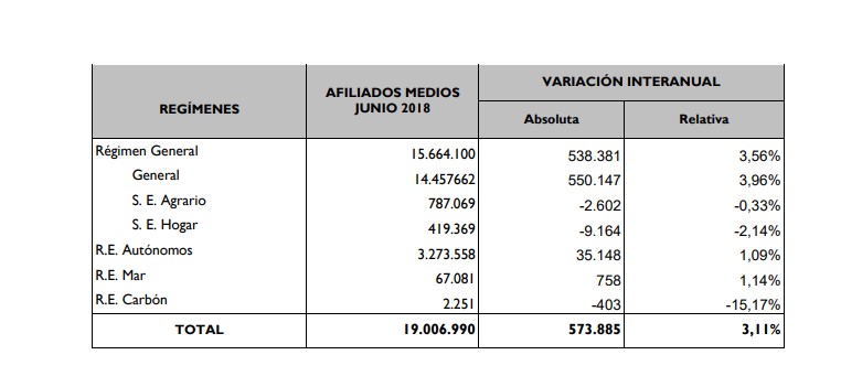 El General es el régimen que más ha elevado su cifra de afiliados en términos interanuales, con 538.381 cotizantes más respecto a junio de 2017 (+3,5%), seguido del Régimen de Autónomos, con 35.148 nuevos cotizantes (+1,1%).