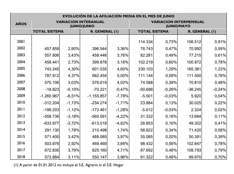 No se lograba superar la barrera de los 19 millones de afiliados desde septiembre de 2008, hace casi una década, según ha destacado el propio Ministerio. En el último año, el número de cotizantes ha aumentado en 573.884 afiliados, a un ritmo del 3,1%, impulsados principalmente por el Régimen General, que ha sumado 538.381 trabajadores desde junio de 2017 (+3,5%).
