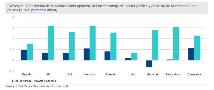 El estudio del BBVA señala la importancia de la productividad de la Administración debido a que el Estado ha gestionado el 42% del PIB durante los últimos 20 años (es la media de las últimas dos décadas, el control sobre el PIB ha ido creciendo). Además de ello, aporta un 20% de Valor Añadido Bruto (VAB) a la economía y que además tiene 3 millones de trabajadores.