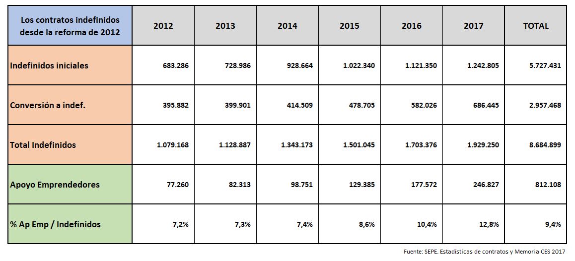 Como vemos en la tabla, tanto el número de contratos indefinidos como el de esta modalidad de apoyo a los emprendedores han ido creciendo año a año desde 2012. La "Memoria sobre la situación socioeconómica y laboral de España 2017" del Consejo Económico y Social, hace un pequeño resumen de la evolución de esta modalidad: "En 2017 se celebraron 246.827 contratos de apoyo a emprendedores, lo que supuso un 39% más que el año anterior, siguiendo la tendencia de continuo aumento en el número de contratos de este tipo realizados desde su puesta en marcha (…) Por grupos de edad, este contrato se realiza mayoritariamente con jóvenes (37%) y trabajadores entre 30 y 44 años (36%), que concentran casi tres cuartas partes del total de contratos realizados, siendo el 26,8 por 100 de los contratos realizados con trabajadores mayores de 45 años".