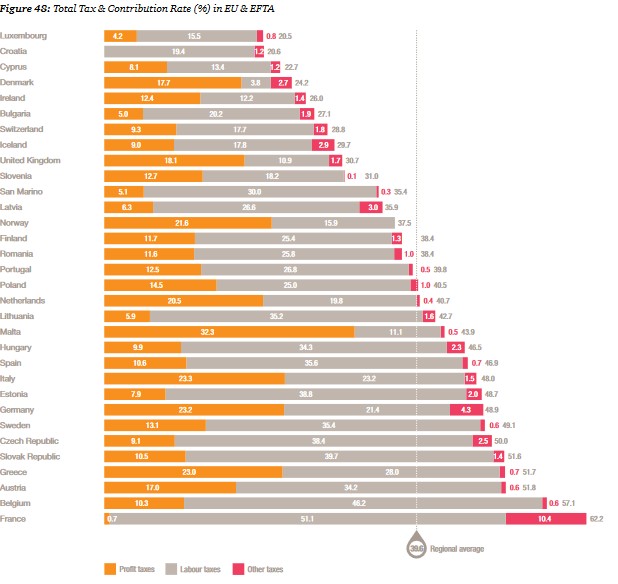 El primero es que las grandes empresas pagan poco. Según un estudio de Javier Santacruz para Civismo, los tipos efectivos sobre el resultado bruto de explotación que pagan las empresas según su tamaño son: 41,67% pequeña empresa, 51% mediana y 61,57% las grandes. El informe Paying Taxes 2018 va en la misma dirección: la presión fiscal de las empresas españolas está por encima de la media de la OCDE, con casi el 47% de sus ingresos destinados a pagar sociedades, IRPF y otros impuestos. En términos de Seguridad Social a cargo del empleador (empresario), España ocupa el dudoso honor de ser el quinto país de la OCDE.