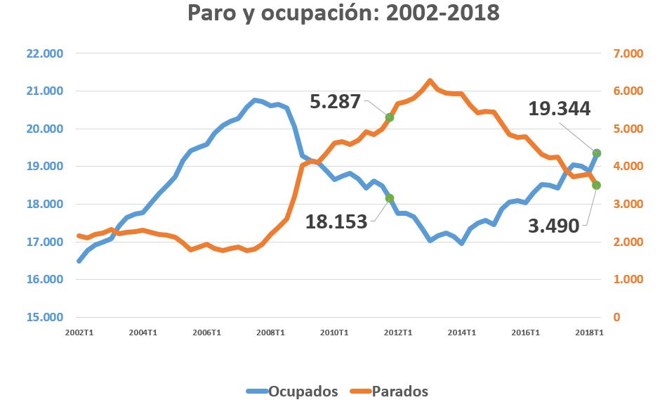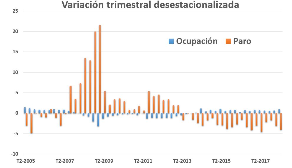 En el cuadro de la derecha (click para ampliar), se muestra la variación (en %), en la serie desestacionalizada del INE, del número de ocupados y parados por trimestre. Así, puede verse que el paro registró 23 trimestres consecutivos de incremento: desde el tercero de 2007 al primero de 2013. Desde entonces, lleva 21 consecutivos reduciéndose (repetimos, en serie desestacionalizada). Y lo contrario puede decirse de la ocupación. Es más, tanto en una variable como en otra, los datos de este segundo trimestre de 2018 son especialmente positivos, con un incremento de la ocupación del 1% (bastante en tasa trimestral) y un descenso del paro del 4,09%.