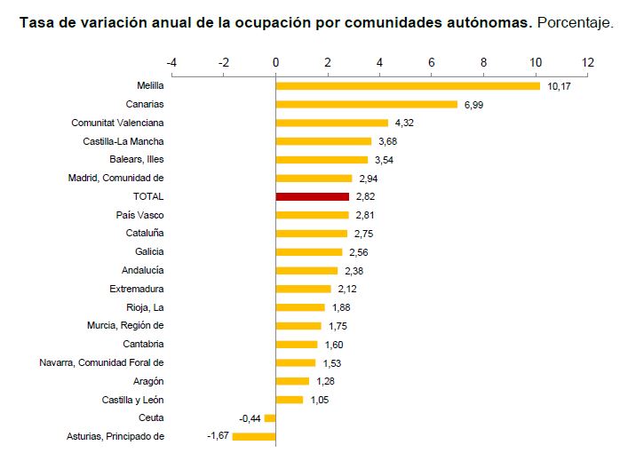 Como vemos, todas las regiones de España han creado empleo. En todas hay ahora más ocupados que hace doce meses. En términos absolutos lideran la clasificación Cataluña (89.900 ocupados más), la Comunidad de Madrid (85.200) y la Comunidad Valenciana (84.900). En términos relativos, las regiones con un crecimiento más importante de la ocupación son Canarias (6,99%), Valencia (4,32%) y Castilla-La Mancha (3,68%) [Nota: a lo largo de todo el artículo no tendremos en cuenta a Ceuta y Melilla debido a los posibles errores de muestreo, por su pequeño tamaño, de los que alerta el INE].