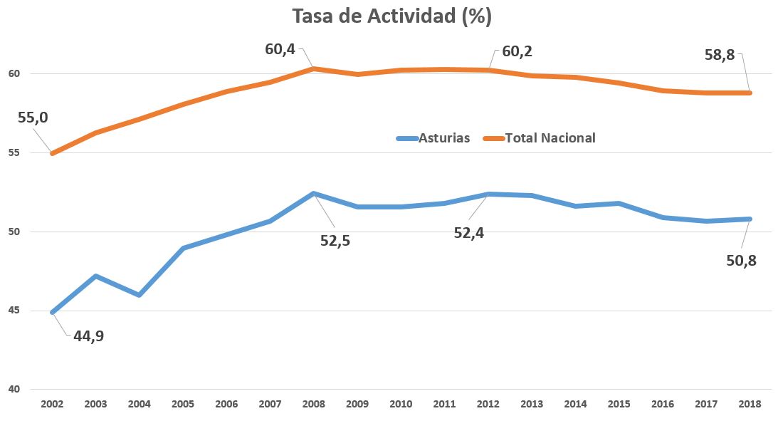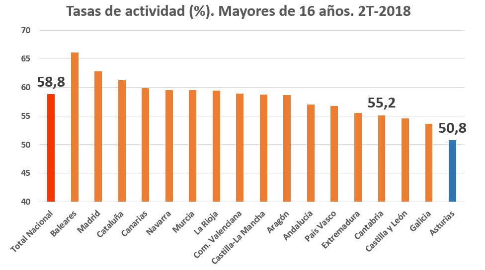 Por ejemplo, este gráfico muestra la tasa de actividad de los mayores de 16 años por comunidades autónomas. Como vemos, Asturias es, con cierta diferencia, la que menos porcentaje de su población adulta tiene en este grupo de activos (personas que tienen un empleo o lo están buscando). Son ocho puntos menos que la media nacional y casi 4,5 puntos menos que su vecina Cantabria (en teoría con un reparto poblacional y económico parecido).