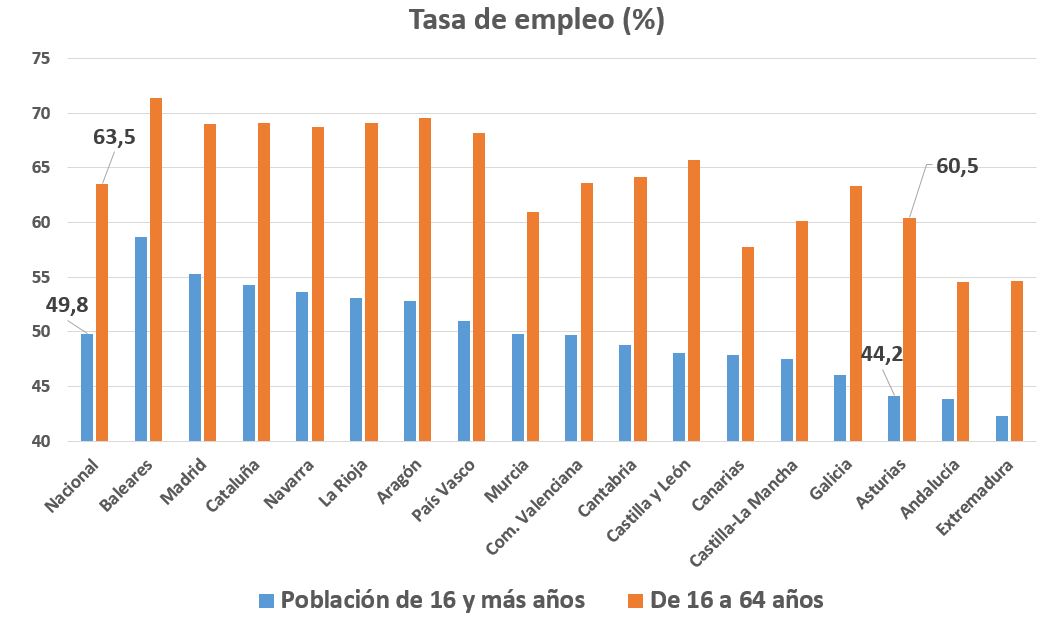Algo parecido ocurre cuando miramos los datos de empleo. De nuevo, Asturias está entre las regiones en las que un porcentaje más reducido de su población adulta tiene un empleo. En este caso no es la última, Andalucía y Extremadura le ganan en esta clasificación. Pero las causas son muy diferentes: en el caso de las dos autonomías del sur, la baja tasa de empleo se debe a la elevadísima tasa de paro (por encima del 23% incluso tras cinco años de recuperación económica); en el caso asturiano, a la baja tasa de actividad que veíamos antes.