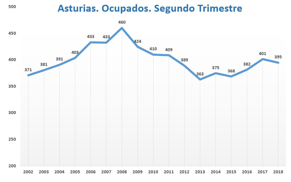 Si alguien quiere ver el vaso medio lleno (y hay que hacer un esfuerzo), puede apuntar que, aunque es cierto que ha bajado el número de ocupados en el último año, lo ha hecho tras varios ejercicios de subida. Y es verdad que los 394.700 ocupados de la última EPA son 32.000 más de los que se contabilizaban en el segundo trimestre de 2013. Pero no deja de ser un consuelo muy menor: en todas las regiones ha subido la ocupación con fuerza en los últimos cinco años. Lo que destaca de Asturias es que ese crecimiento ha sido mucho menor que en el resto.