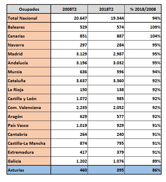 En esta tabla mostramos la diferencia entre el número de ocupados del segundo trimestre de 2008 y 2018. Hablamos de hace justo una década, cuando todavía la crisis apenas no se hacía sentir y los niveles de empleo estaban casi en máximos (el récord de ocupación se había logrado en el tercer trimestre de 2007). Como vemos, la mayoría de las regiones todavía no han recuperado las cifras de empleo de hace diez años. Pero, de nuevo, destaca Asturias: es la que tiene una diferencia más marcada con el nivel de hace una década y con cierta diferencia. Hoy trabajan en el Principado 65.000 personas menos (un 14%) que en 2008.