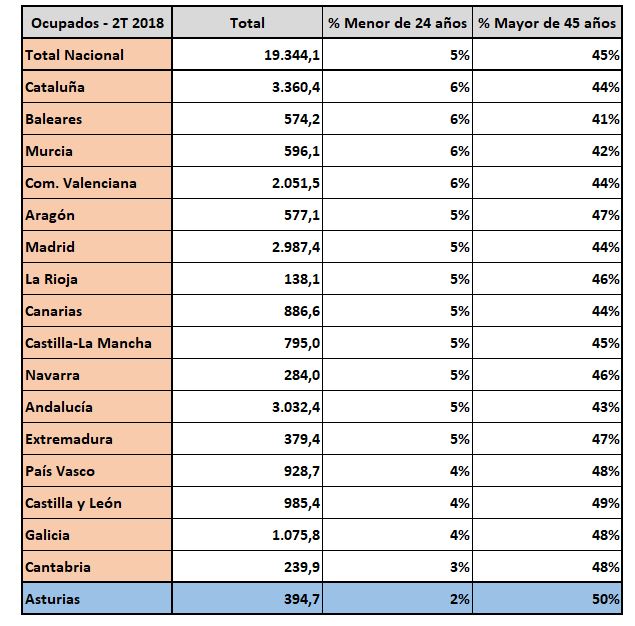 Y la cosa no pinta bien en el futuro a medio plazo. La tabla que podemos ver sobre estas líneas clasifica a las regiones españolas en función de dos variables: porcentaje de ocupados con menos de 24 años y porcentaje de ocupados con más de 45 años. Pues bien, Asturias lidera ambas: en una a la cabeza de la lista y en la otra a la cola. Ninguna autonomía tiene menos jóvenes trabajando (respecto del total de personas con un empleo) ni ninguna tiene más personas con una edad cercana a la de jubilación. Hablamos de un mercado laboral muy envejecido y en el que no se atisba un relevo a corto plazo. Es cierto que no es un fenómeno exclusivo de Asturias, toda España tiene un problema con el envejecimiento de la población y del mercado laboral, pero en esta región se agudizan ambas tendencias.