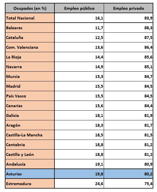 Este fenómeno de falta de oportunidades también puede intuirse entre las cifras de la anterior tabla. En este caso, lo que muestra es el reparto empleo público-privado por regiones. De nuevo, Asturias destaca, aunque no es la última (Extremadura la supera, con casi 1 de cada 4 empleados en el sector público). En realidad, es una consecuencia lógica de todo lo anterior: en una región envejecida y con cada vez un mayor número de inactivos (sobre todo pensionistas), el gran empleador acaba siendo el Estado o la comunidad autónoma, sobre todo a través de servicios sanitarios o sociales. Hablamos de una región que no hace tanto era una de las más prósperas y dinámicas de España, con un aparato productivo-empresarial pujante, competitivo y diversificado. Merece la pena preguntarse qué ha pasado en las últimas décadas (esto no es un fenómeno que se haya fraguado en unos años).