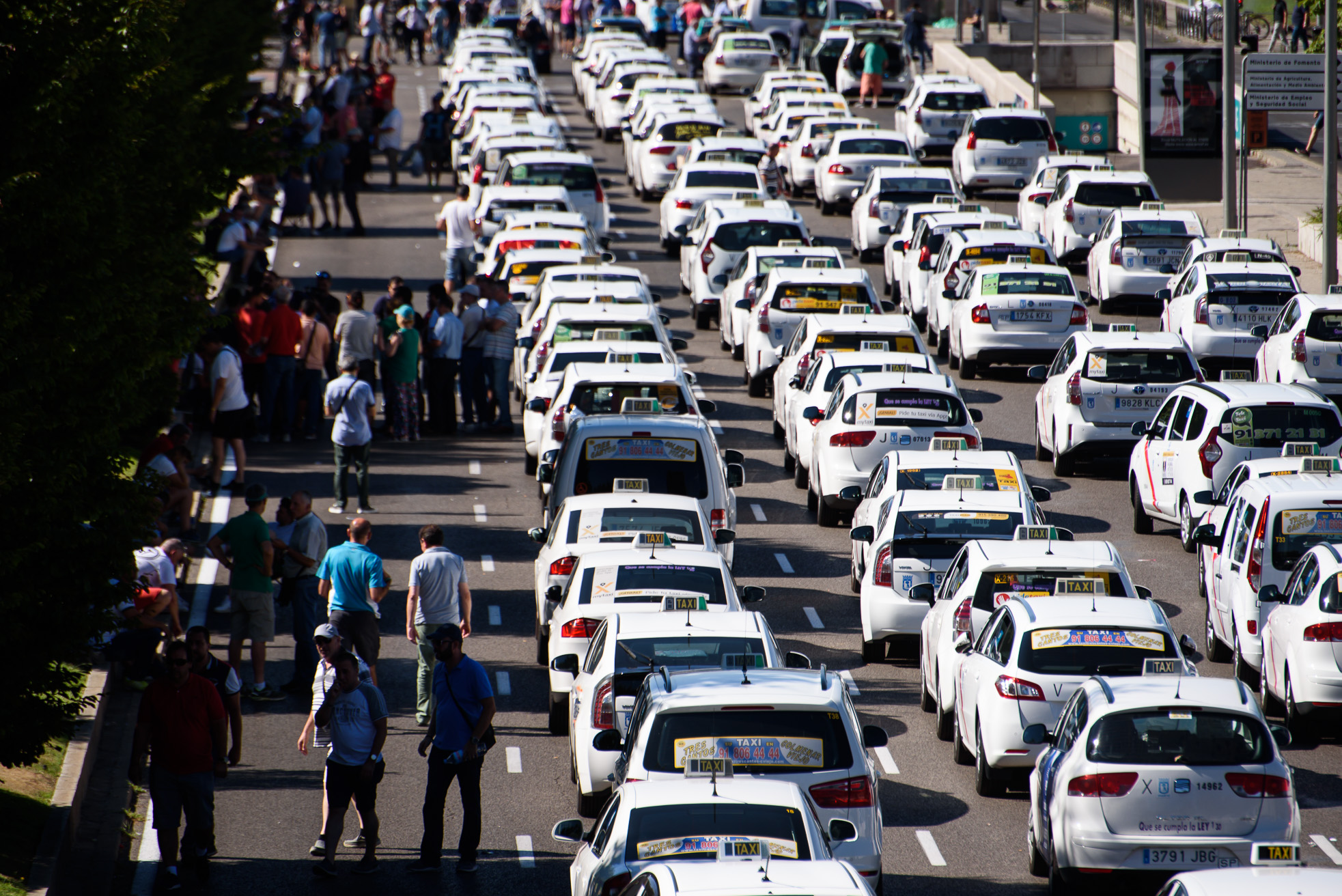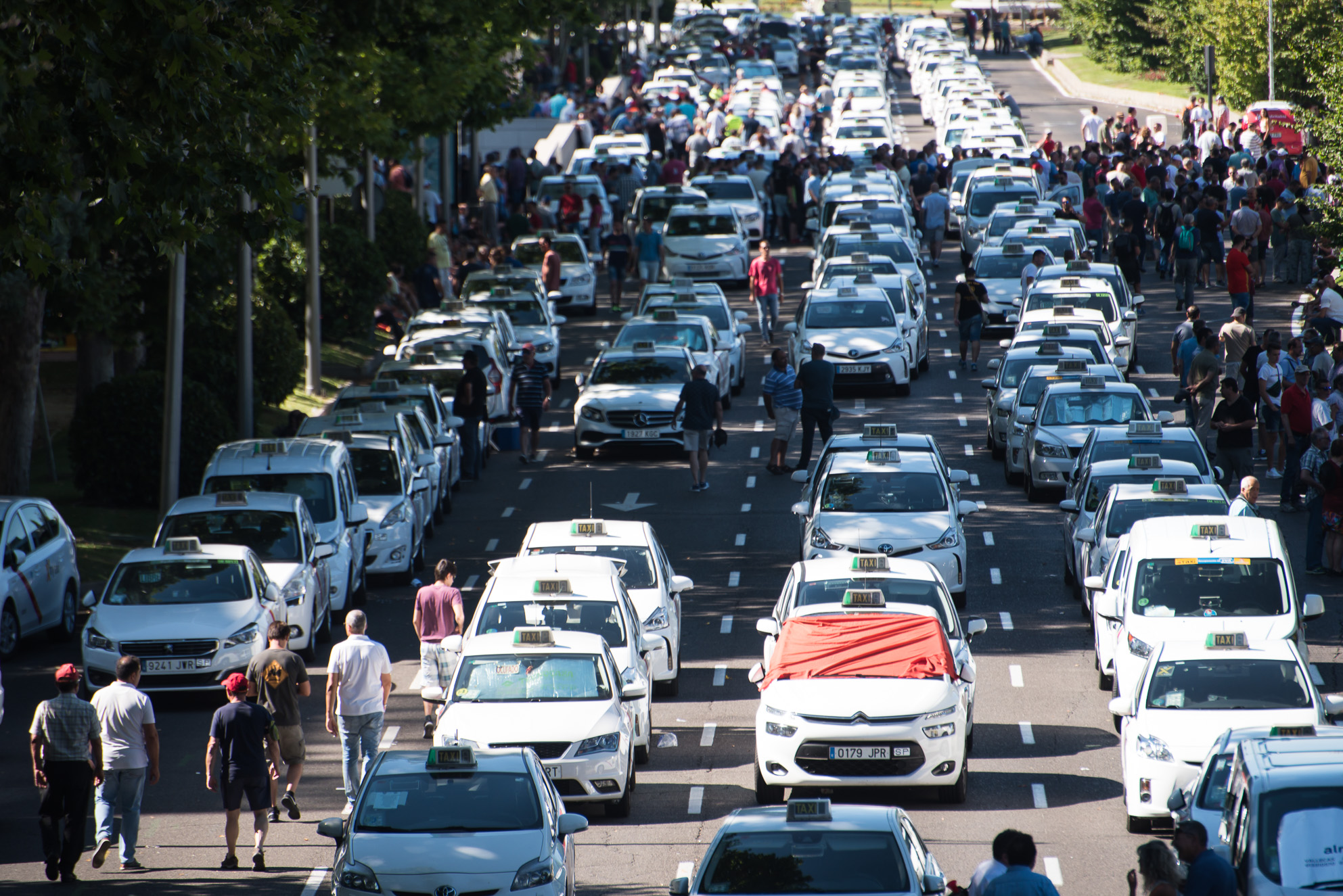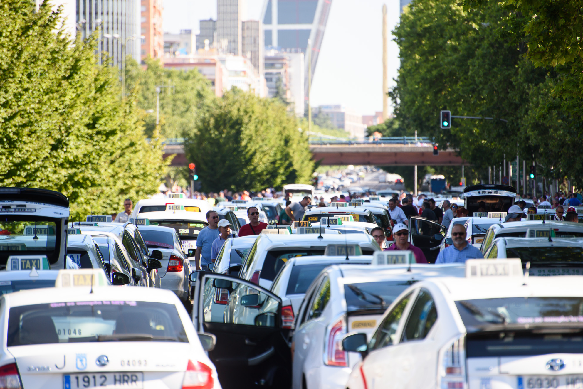 Vista general del Paseo de la Castellana con miles de taxis aparcados sobre el asfalto.