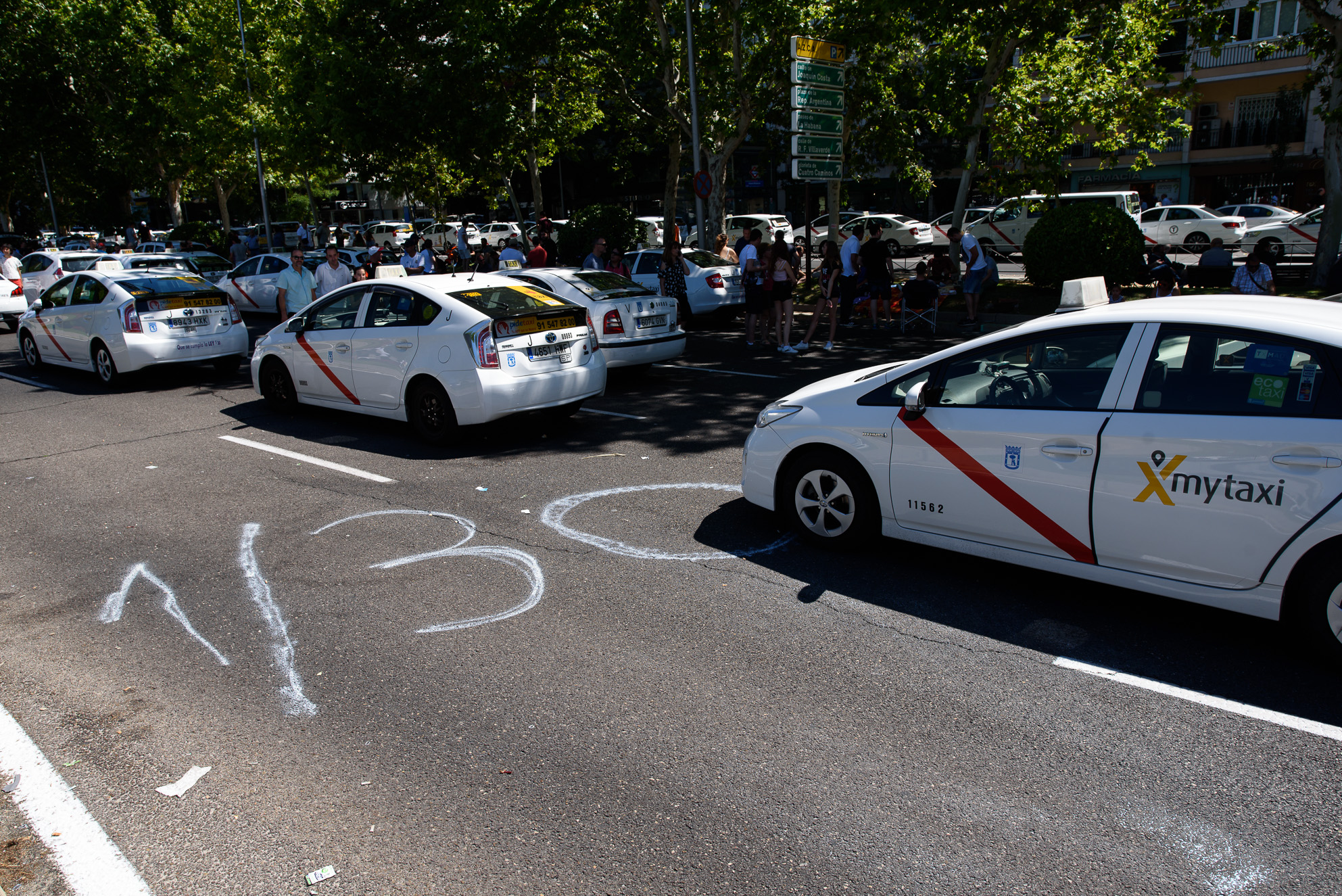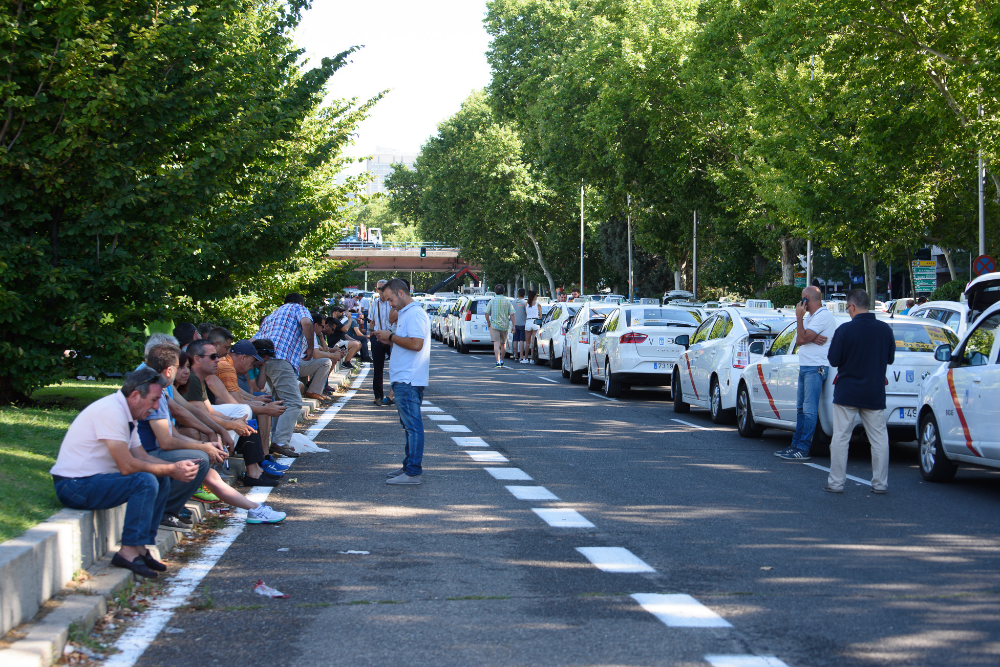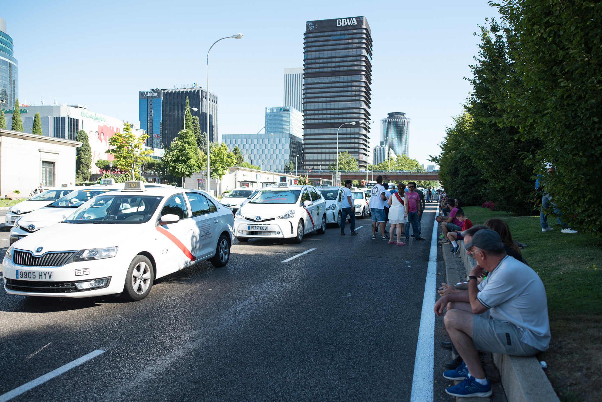 Vista general del Paseo de la Castellana con miles de taxis aparcados sobre el asfalto.