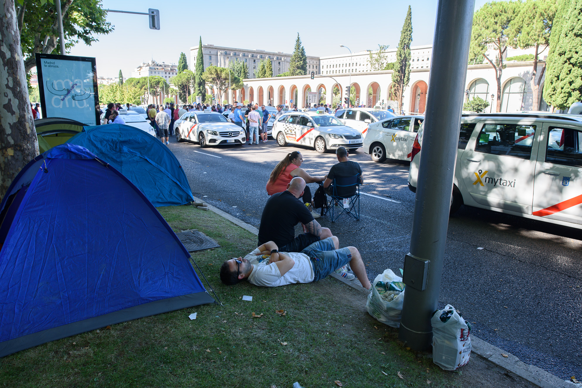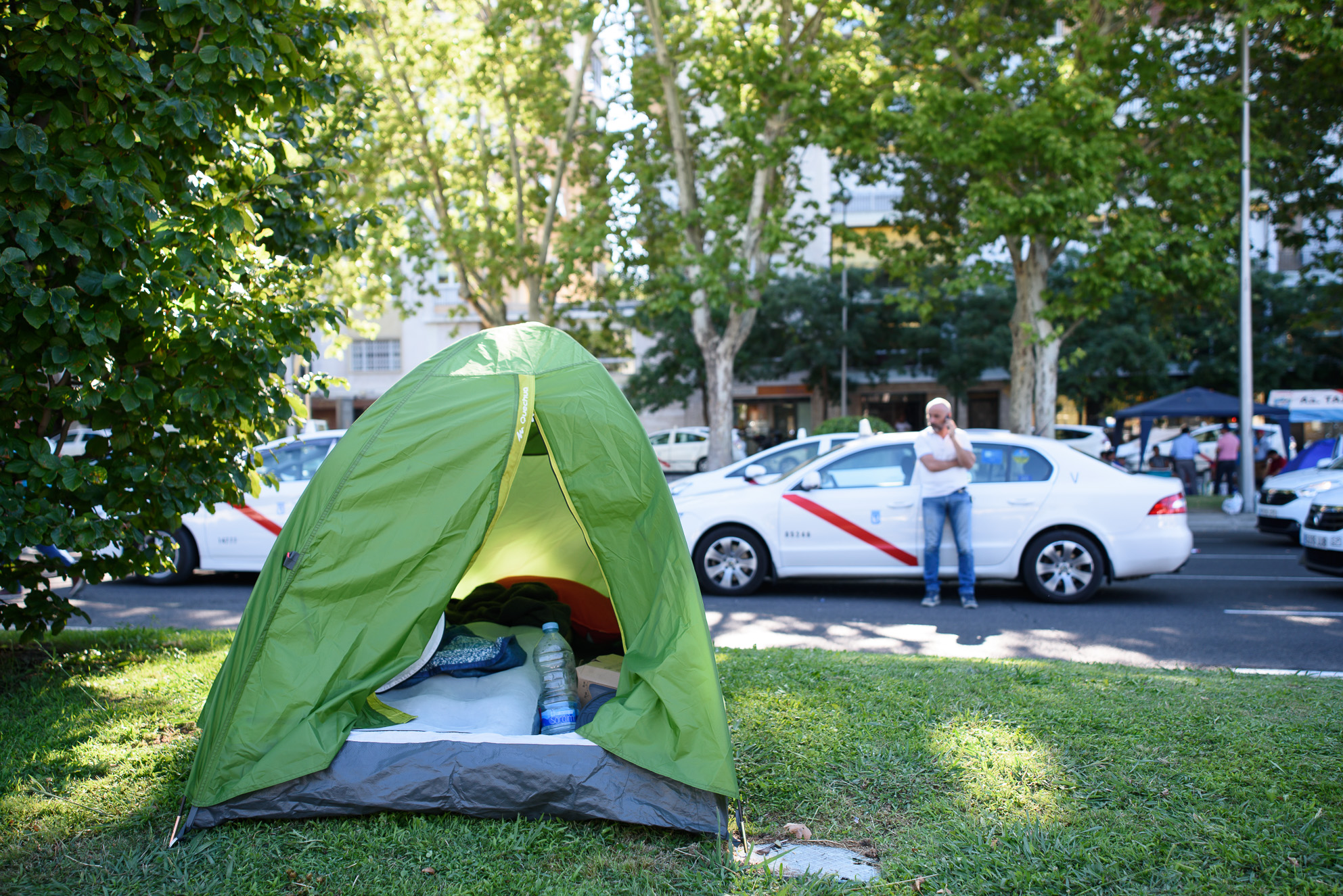 Varias tiendas de campaña se han desplegado sobre el asfalto de la Castellana entre los taxis.