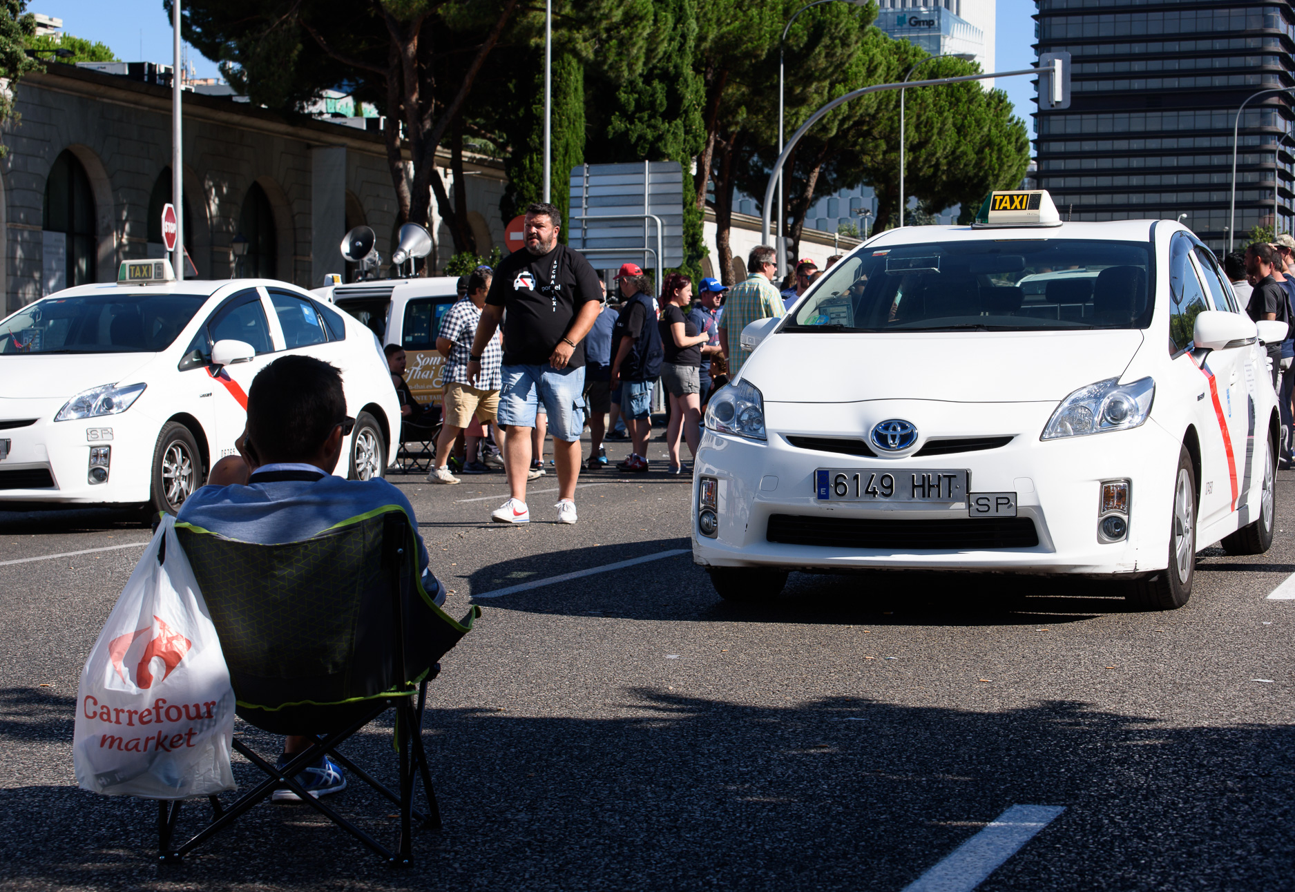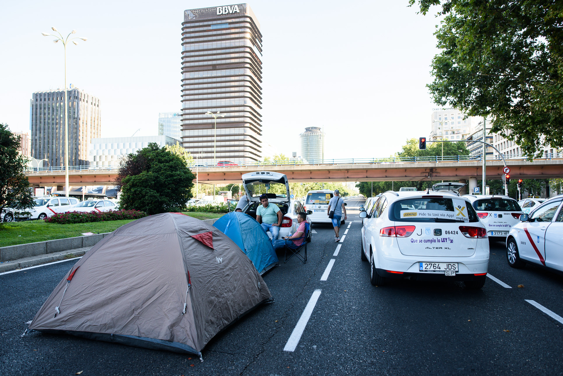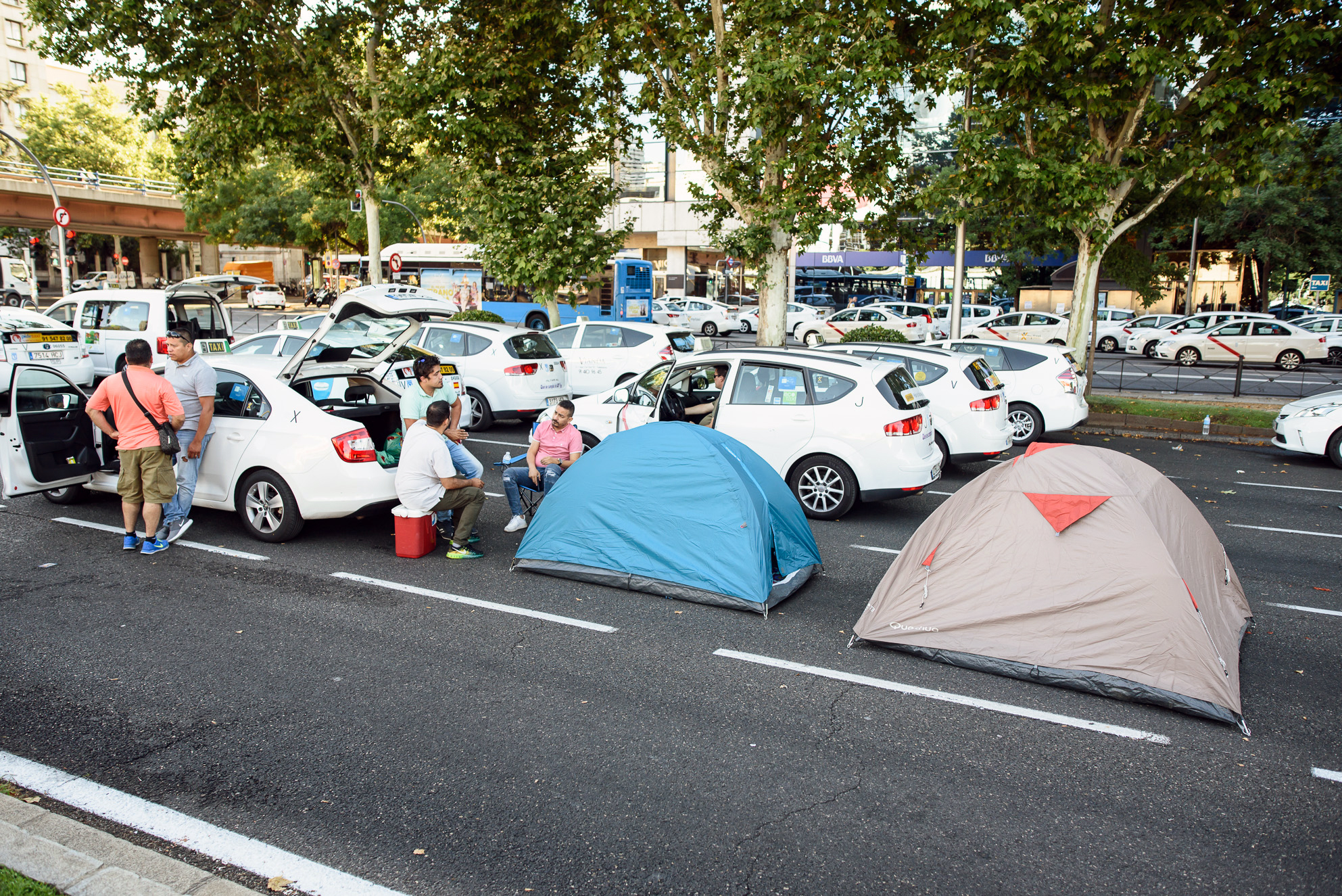 Miles de conductores han salido a la calle a rebelarse contra las nuevas plataformas. En el céntrico Paseo de la Castellana han pasado la noche muchos de ellos durmiendo en el propio vehículo en tiendas de campaña sobre el asfalto. Durante dos días la arteria principal de la ciudad permanece cortada por la protesta del sector.