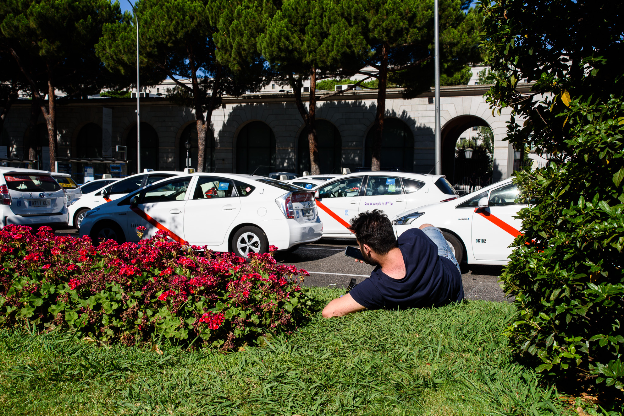 Un trabajador del taxi descansa sobre el césped de la mediana en pleno Paseo de la Castellana de Madrid.