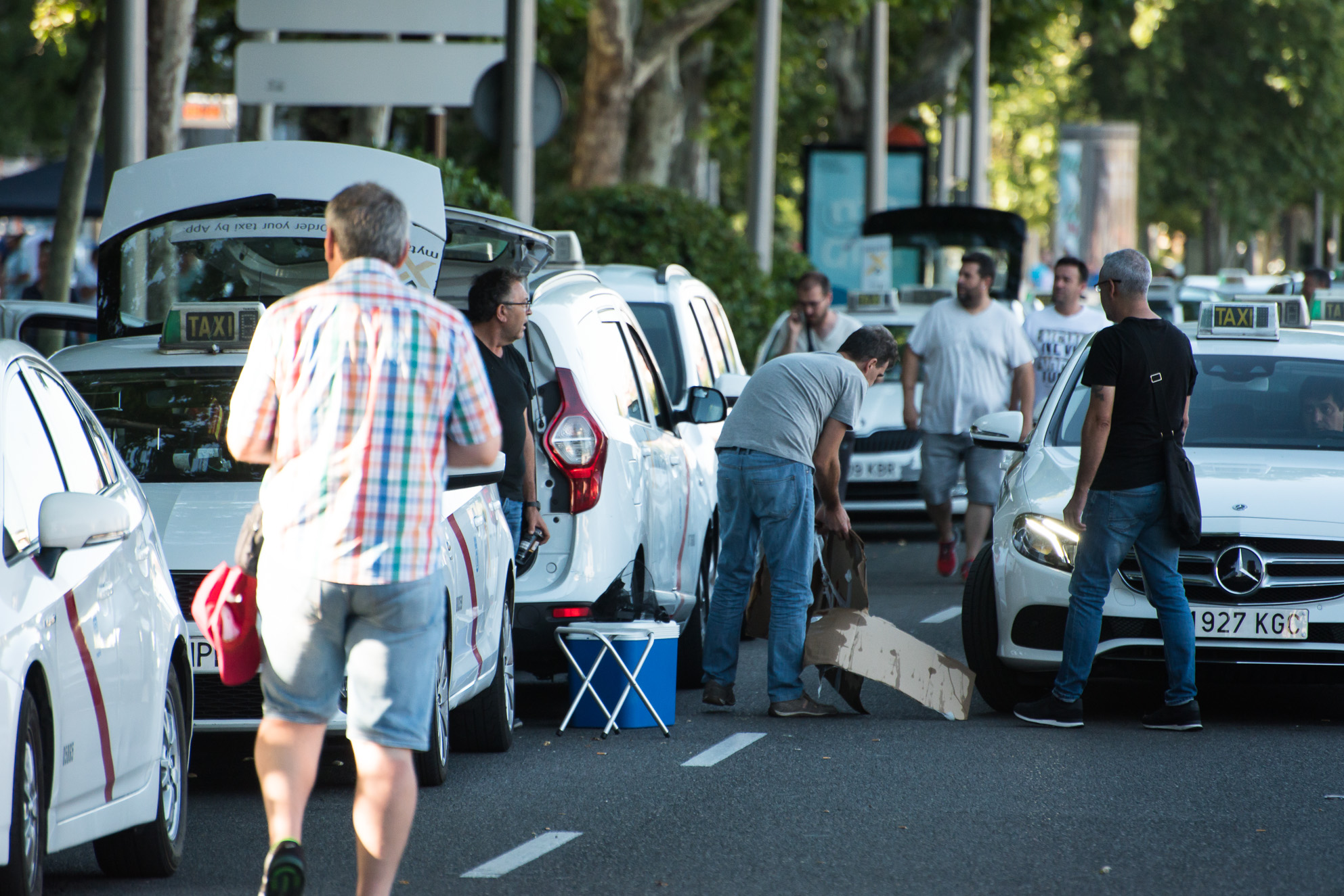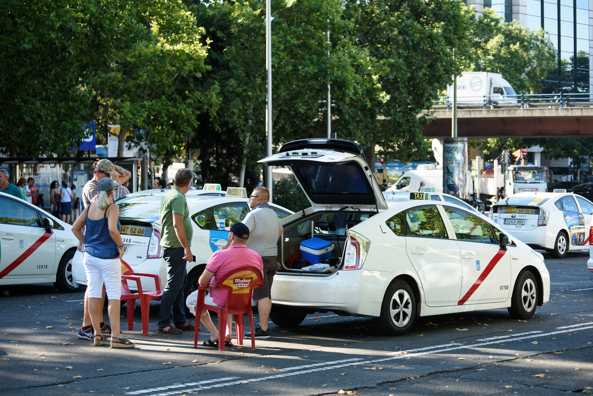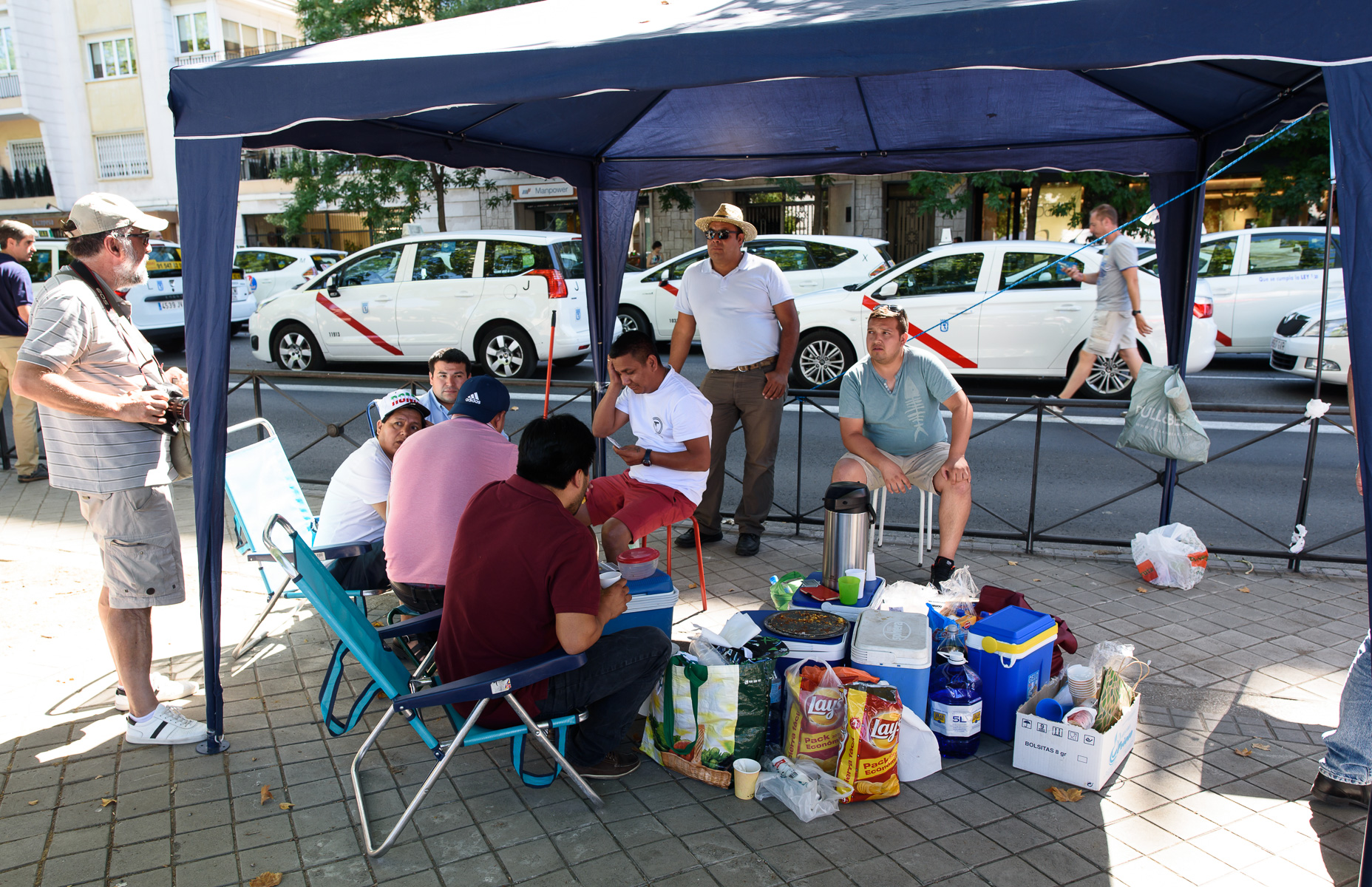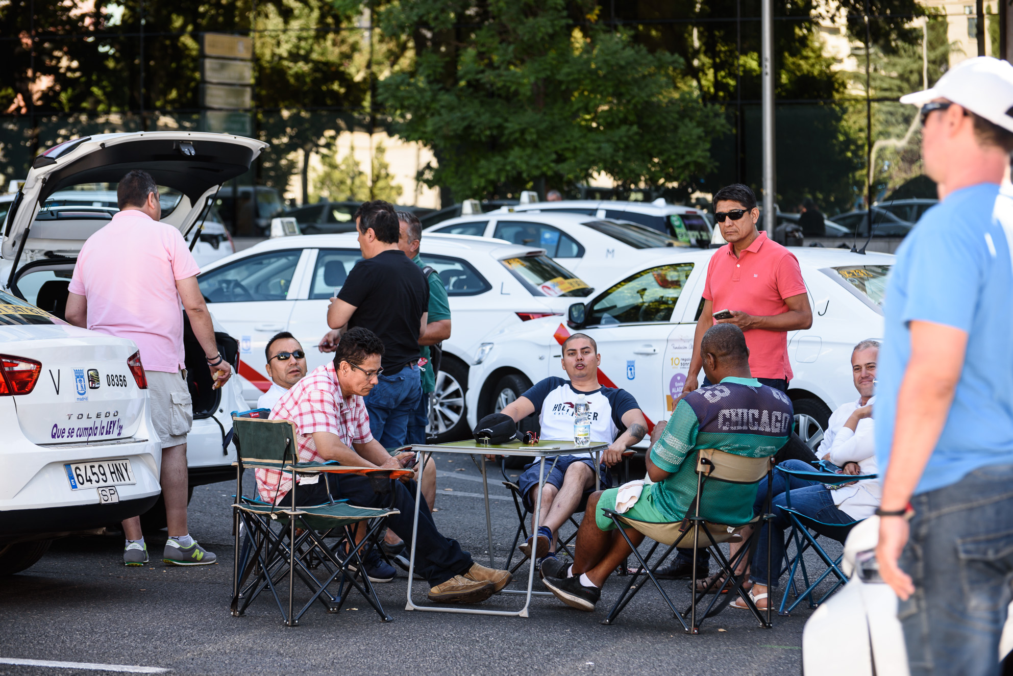 Pasar el tiempo de la forma más amena. Muchos taxistas han optado por llevar mesas y sillas para estar más cómodos durante la segunda jornada de huelga del sector en Madrid.