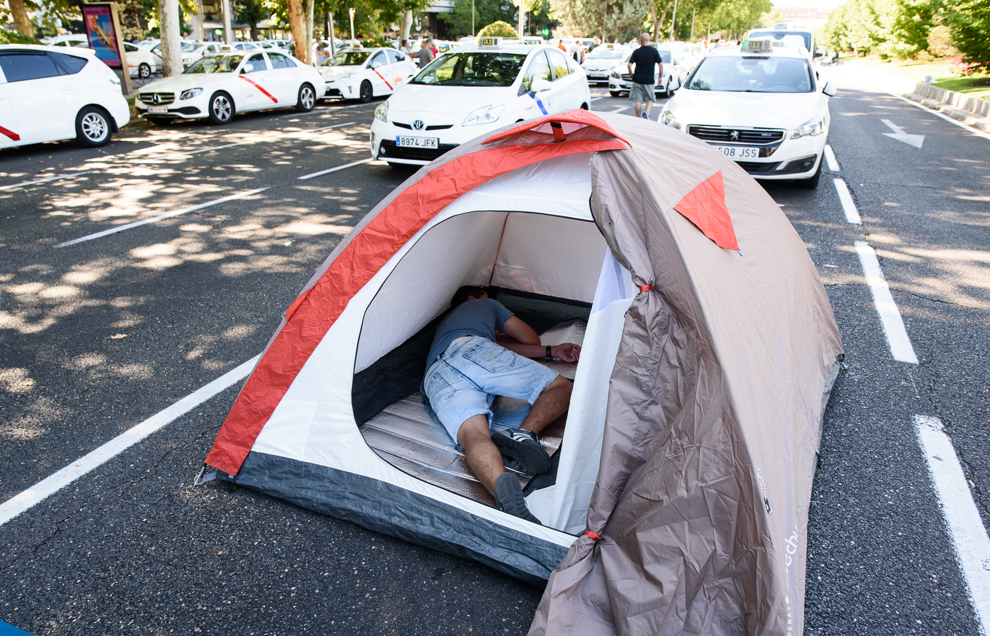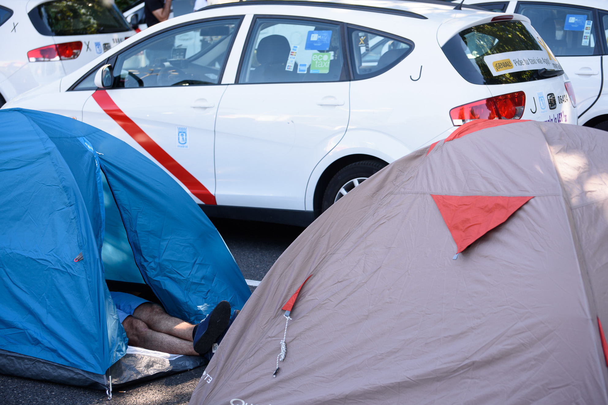 Las piernas de un taxista asoman por la puerta de su tienda de campaña a primera hora del martes, segundo día de protesta del sector.