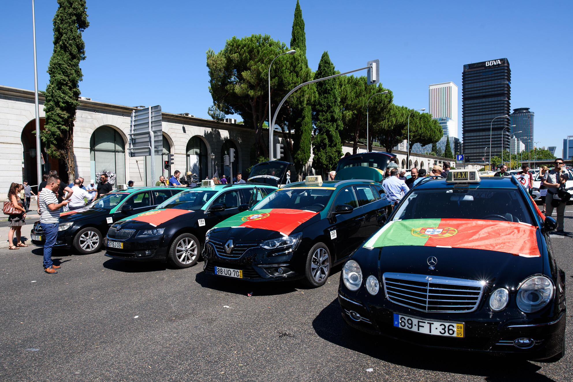 Cuatro taxis provenientes de Portugal se han sumado a la protesta del sector en Madrid.