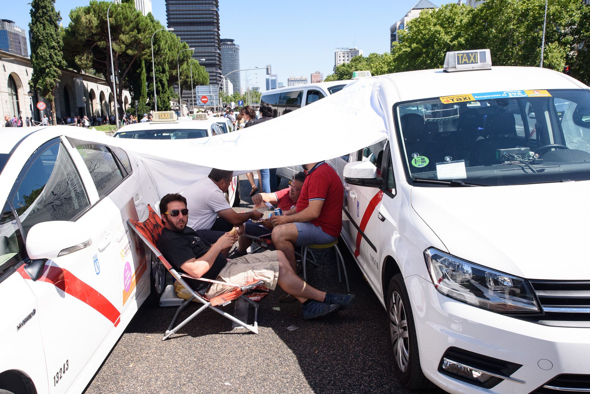 Un toldo improvisado entre los taxis para protegerse del calor y el sol.