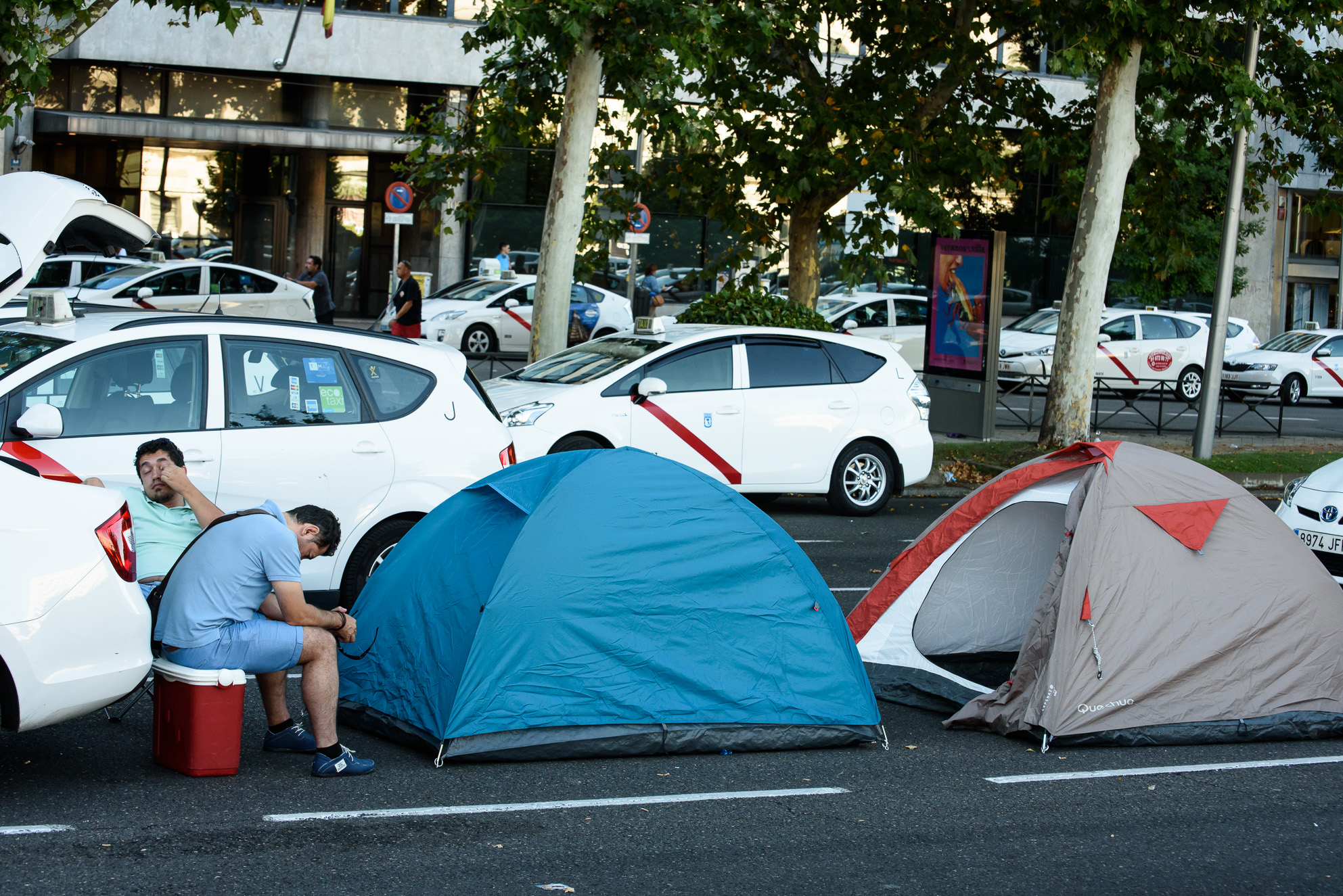 Dos taxistas comienzan a despertarse después de haber pasado la noche en sus respectivas tiendas de campaña sobre el asfalto de la Castellana de Madrid.