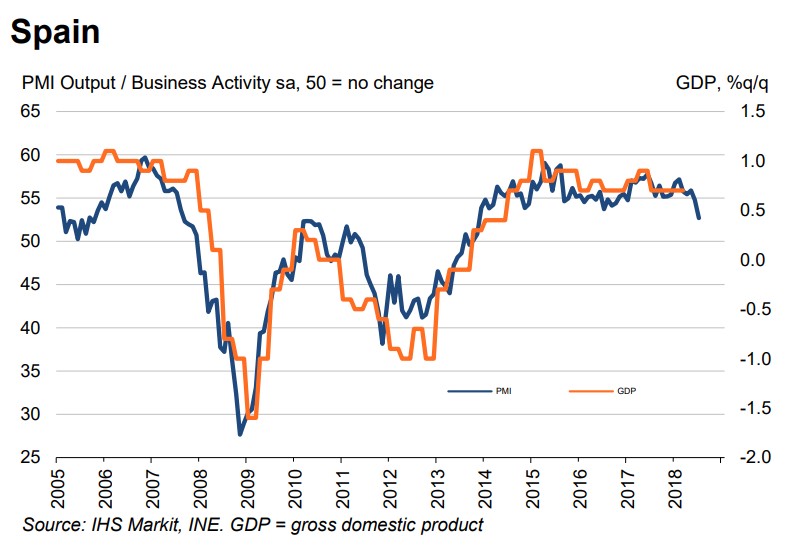 Julio no ha sido un buen mes en materia económica. Tras el menor crecimiento registrado en el segundo trimestre, parece que esta tendencia se mantiene, a la vista de los últimos indicadores publicados. El sector privado, auténtico motor de la economía, acaba de registrar el peor avance en 56 meses, según el índice PMI compuesto elaborado por Markit. De hecho, España registra la peor lectura entre las grandes potencias del euro, con apenas 52,7 puntos -una puntuación por debajo de 50 indica contracción económica-.