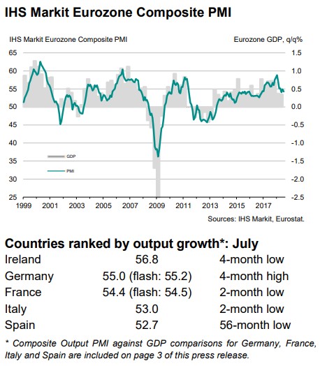 La media de la zona euro se situó en 54,3 puntos, su nivel más bajo en dos meses, después de que sólo Alemania mejorase sus cifras de actividad. Entre las economías analizadas, Irlanda registró en julio el mayor dato de PMI compuesto, con 56,8 puntos, su mínima en 4 meses, por delante de los 55 puntos de Alemania, su máxima en 4 meses, así como de Francia, con 54,4 puntos, su mínima en 2 meses, y de Italia, con 53 puntos, su peor lectura en 2 meses.