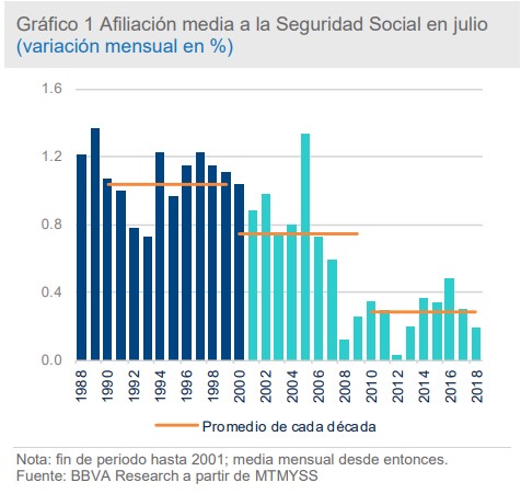 Sin embargo, si el análisis se centra tan sólo en el mes de julio, el resultado resulta, como mínimo, decepcionante, sobre todo en afiliación. Y es que, esos 35.819 nuevos cotizantes es la cifra más baja en un mes de julio desde 2013, cuando se registraron 32.890 afiliados, momento en el que España comenzaba a salir de la recesión económica. El empleo sigue creciendo, sí, pero en 20.000 personas menos que hace justo un año y casi la mitad de lo que prevía, por ejemplo, BBVA Research (67.800 personas).