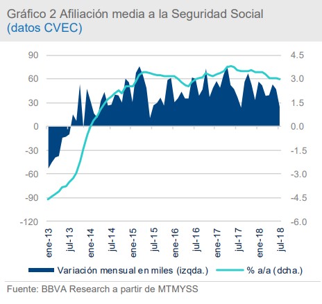 A este respecto, la citada entidad constata que la creación de empleo se moderó en el inicio del tercer trimestre, ya que la ocupación ha perdido "tracción". Una vez eliminado el efecto estacional, que permite analizar la evolución del mercado laboral con independencia del momento del año, se observa que el número de afiliados tan sólo aumentó en 25.000 personas, unos 20.000 menos que en el promedio del segundo trimestre.