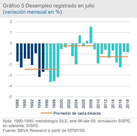 Pese a ello, el desempleo se comportó en julio en línea con lo previsto, tras caer en algo más de 27.000 personas frente a las estimaciones iniciales de 31.000. De hecho, el descenso relativo del paro fue similar al registrado hace un año, aunque se situó por debajo de la reducción promedio de los meses de julio de la última década. Los servicios y la construcción explicaron más de la mitad de la reducción del desempleo en julio.
