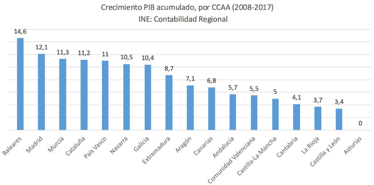 La comunidad autónoma de las Islas Baleares es la región que más ha aumentado el tamaño de su economía a lo largo de la última década. Así se deduce de las cifras de Contabilidad Regional que acaba de divulgar el Instituto Nacional de Estadística. Según dicha serie, Asturias ocupa el lugar opuesto y, entre 2008 y 2017, no ha conseguido aumento alguno en su PIB.