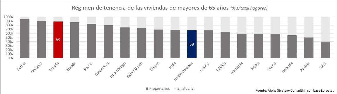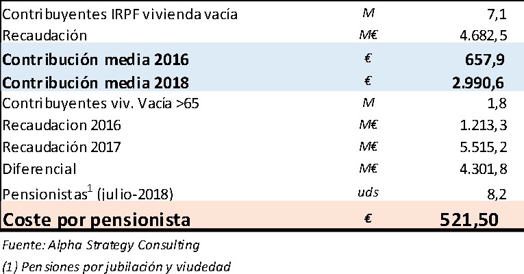 En julio de 2018, había 8,2 millones de personas recibiendo pensiones de jubilación y de viudedad, según los datos de la Seguridad Social. De ellos, el 89% tiene vivienda en propiedad, según el INE, y un promedio de 1,4 viviendas por hogar. O, lo que es lo mismo, 7,5 millones de viviendas con sus miembros mayores de 65 años.