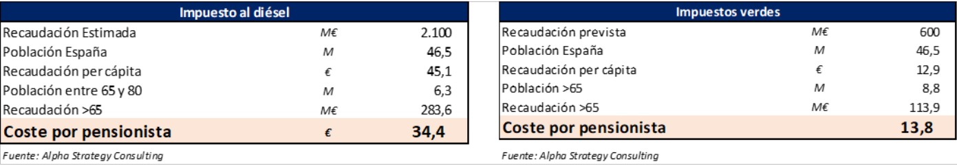 Lo que sí que sabemos es que pagarán un incremento en el recargo en el IRPF por viviendas vacías del 1,1% al 5%, el impuesto de 15 céntimos al diésel y la batería de impuestos verdes que está empeñado en sacar adelante el Gobierno. El que más impacto tiene es el incremento del recargo en el IRPF por vivienda vacía, que afecta a las 1,8 millones de viviendas vacías en manos de pensionistas. El incremento del 355% de la contribución media planteada por el Gobierno supone más de 500€ al año que saldrán de sus bolsillos.