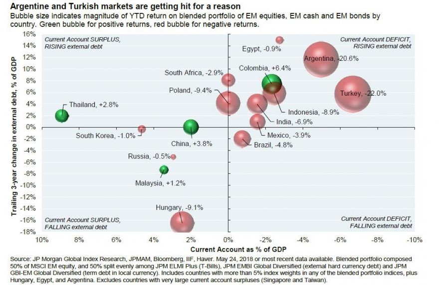 En general, los países que sufren un mayor déficit por cuenta corriente y una deuda externa más elevada, siendo, por tanto, más dependientes de la financiación exterior, ostentarán un mayor grado de vulnerabilidad ante la menor liquidez disponible. Argentina -que ya ha tenido que solicitar un rescate al FMI- y Turquía encabezan esta particular lista, pero le siguen otros países, desde Colombia y Sudáfrica hasta Indonesia, India, Brasil, México, China...