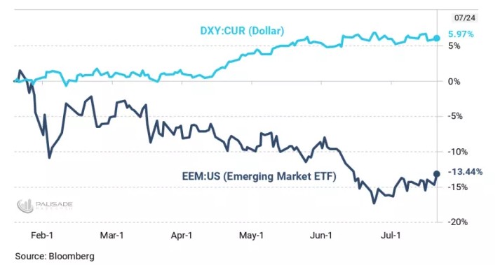 De ahí que la lira turca haya caído cerca de un 70% en el último lustro, coincidiendo con la subida de tipos en EEUU, o que el rally experimentado por el dólar en los últimos seis meses se haya reflejado en una depreciación de la particular cesta que componen las monedas emergentes.