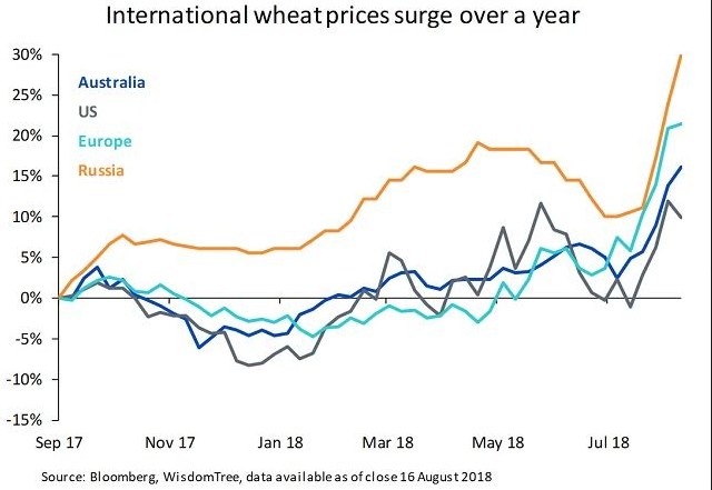 Los grandes productores de trigo de Estados Unidos, Rusia, Australia y la Unión Europea se enfrentan al primer déficit de producción en seis años, una situación que ha revalorizado esta materia prima un 24% en lo que va de año. En términos pragmáticos, esto se traducirá en un aumento final del precio del pan, entre otros productos. "Los precios internacionales del pan están aumentando como respuesta a un aumento de los precios del trigo", según señalan los analistas de Wisdom Tree.