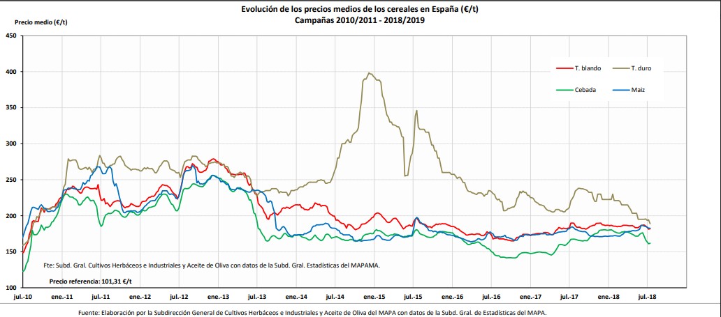 En España, la subida del precio ha sido mucho más suave que en el resto del mundo. Desde julio de 2017, una tonelada de trigo blando se vende entre 170 y 190 dólares, la oscilación en los precios es bastante baja en los últimos doce meses. Si, además, se compara lo sucedido con el trigo duro, el descenso en el precio de venta es notable. En diciembre de 2014, una tonelada de trigo duro español se vendía a 400 euros, actualmente, se encuentra por debajo de los 195.
