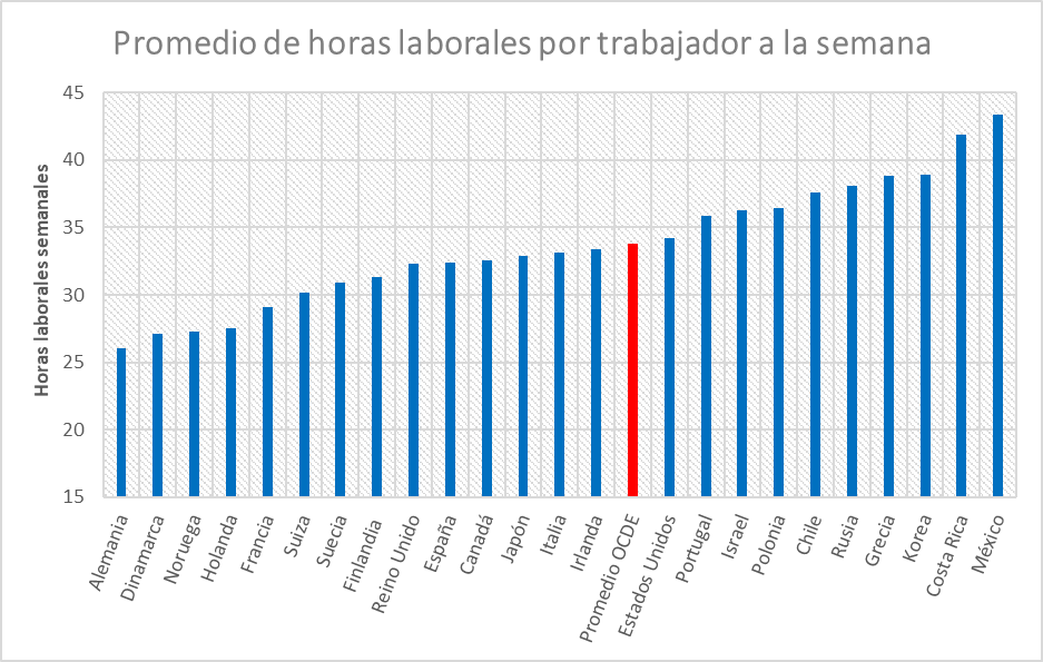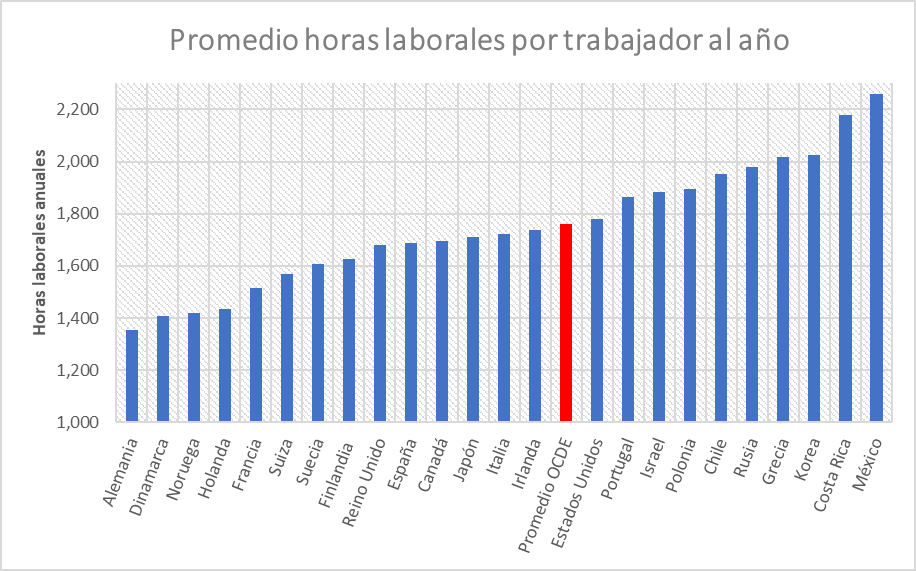 Al empezar a hablar de trabajo duro, surge la duda de cómo explicarlo. ¿En base a fuerza o inteligencia? Una forma fácil de intentar medirlo es en base a las horas trabajadas por trabajador. El gráfico 1 muestra las horas promedio laboradas por trabajador al año y la gráfica 2 muestra las horas promedio laboradas por trabajador a la semana en diferentes países de la OCDE.