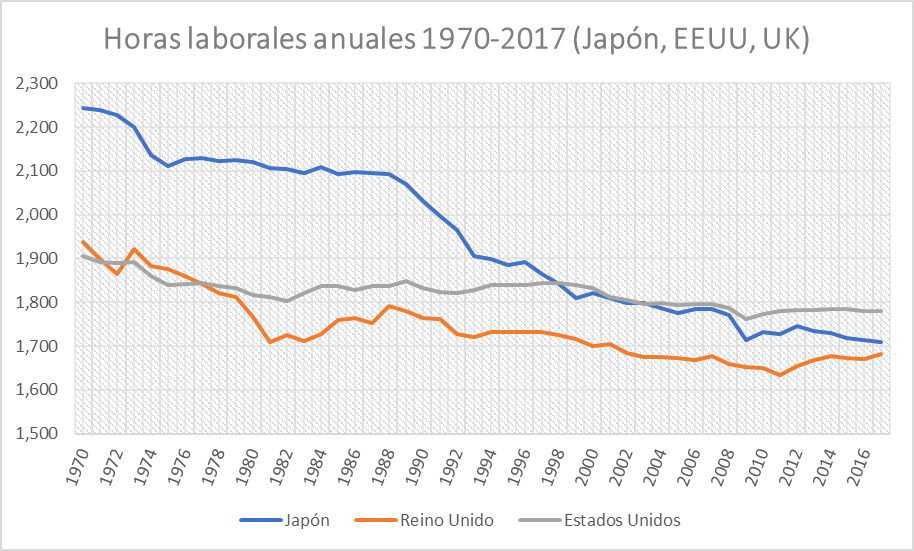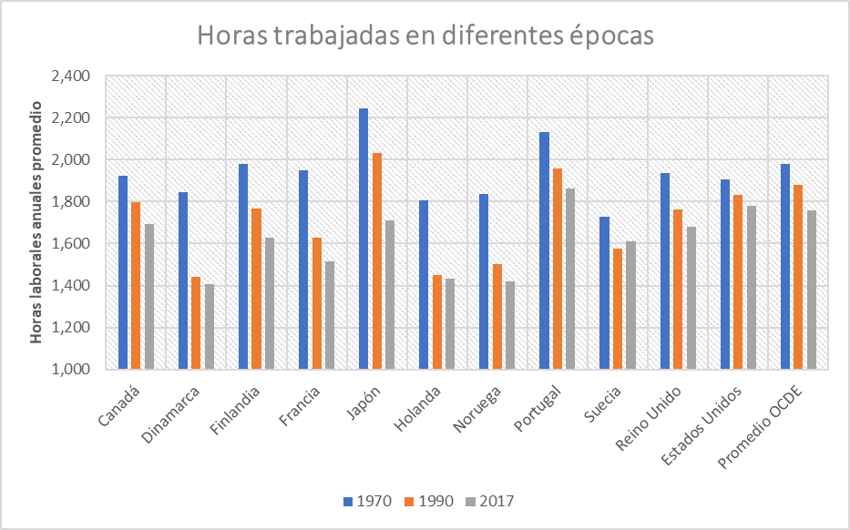 Después de los 70's, hubo una marcada disminución del número de horas dedicadas a trabajar en los países de la OCDE, tendencia más marcada en países europeos. En el caso de Japón, la disminución en 40 años fue de más de una cuarta parte.