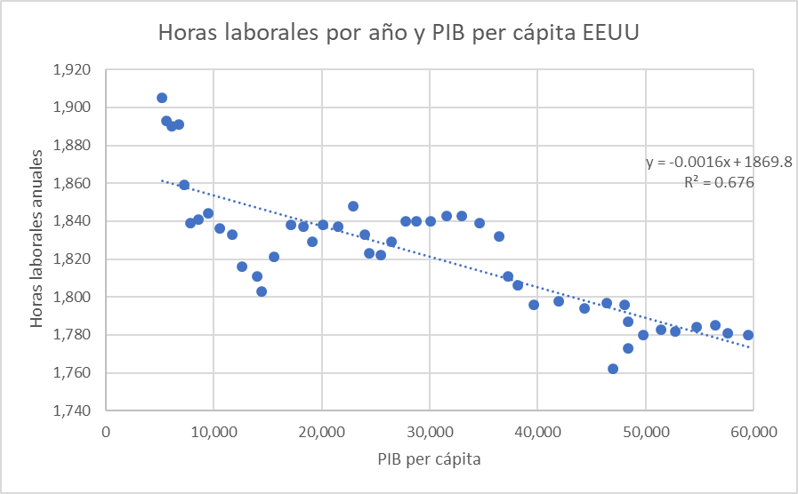 Analizando datos de horas laborales anuales y cruzándolos contra PIB per cápita se puede ver que larelación riqueza-cantidad de horas trabajadas que estamos apuntando es cierta (gráfica 5). A mayor PIB per cápita, menos horas laboradas por año. La riqueza en las sociedades provoca menor necesidad de trabajo. Pero la pregunta queda todavía abierta, ¿por qué?