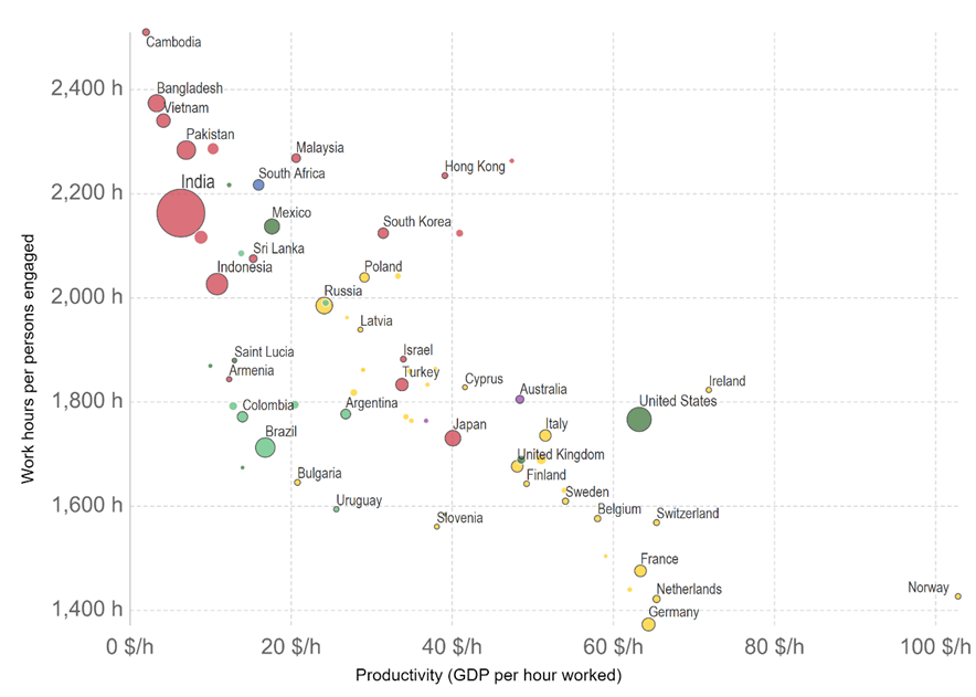 La respuesta rápida a la pregunta de por qué los trabajadores en economías desarrolladas trabajan menos que en países más pobres es porque la productividad del trabajador promedio en países ricos es mayor. Al tener mayor acceso a tecnología y técnicas que eficienticen su trabajo, se requiere de menos horas laborales para conseguir el mismo resultado, o incluso uno mejor. La gráfica 6 muestra la relación entre la productividad y las horas laborales anuales promedio para el año 2014. La productividad se mide como el PIB por hora trabajada.