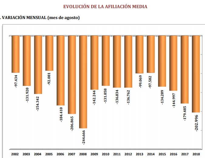 En concreto, la Seguridad Social perdió una media de 202.996 afiliados (-1,07%) respecto al pasado julio, hasta un total de 18.839.814 cotizantes. Se trata del mayor descenso en un mes de agosto desde 2008, uno de los peores años de la crisis, cuando la afiliación bajó en 244.000 personas.