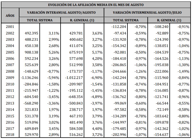 Pese a todo, la Seguridad Social sumó una media de 529.970 afiliados en los últimos doce meses, un 2,89%, aunque se trata del peor ritmo desde 2014, muy inferior al registrado en agosto de 2017, cuando el empleo crecía a un ritmo del 3,45% interanual.