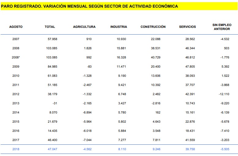 Por otro lado, el número de parados registrados en las oficinas del antiguo Inem subió en 47.047 personas respecto a julio, hasta un total de 3.182.068 desempleados. Se trata, igualmente, del mayor incremento en un mes de agosto desde 2011 (+51.185), cuando España estaba todavía sumida en la recesión. En todos los meses de agosto desde 2001 ha aumentado el paro, salvo en 2013, cuando se redujo en 31 personas.Y, aunque Trabajo resalta que en términos desestacionalizados el paro se redujo en agosto en 2.819 personas, es el peor registro en este mes desde 2012, otro año fatídico en materia económica.