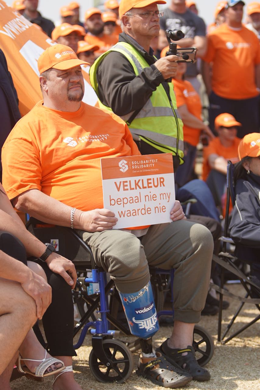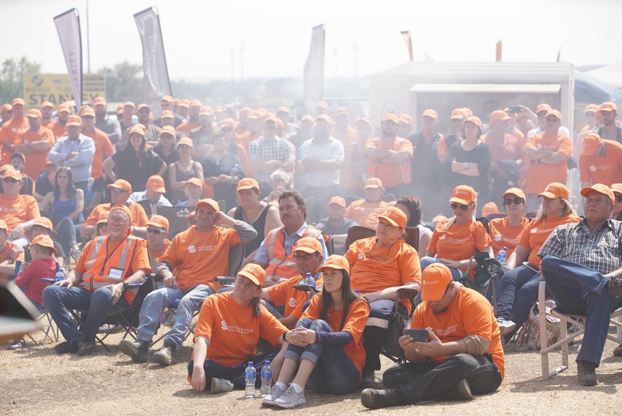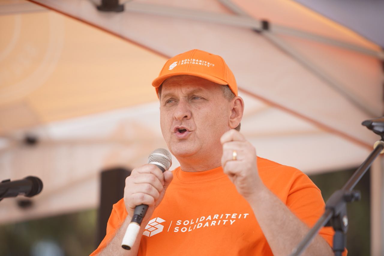 El director ejecutivo de Solidaridad, Dirk Hermann, se dirige a sus afiliados durante la protesta de hoy. Solidaridad es un sindicato de orientación liberal-conservadora. Sus acciones legales contra algunas prácticas laborales de discriminación positiva del gobierno sudafricano que atentaban contra los derechos de los trabajadores blancos han obligado al Estado a rectificar en favor de los damnificados.