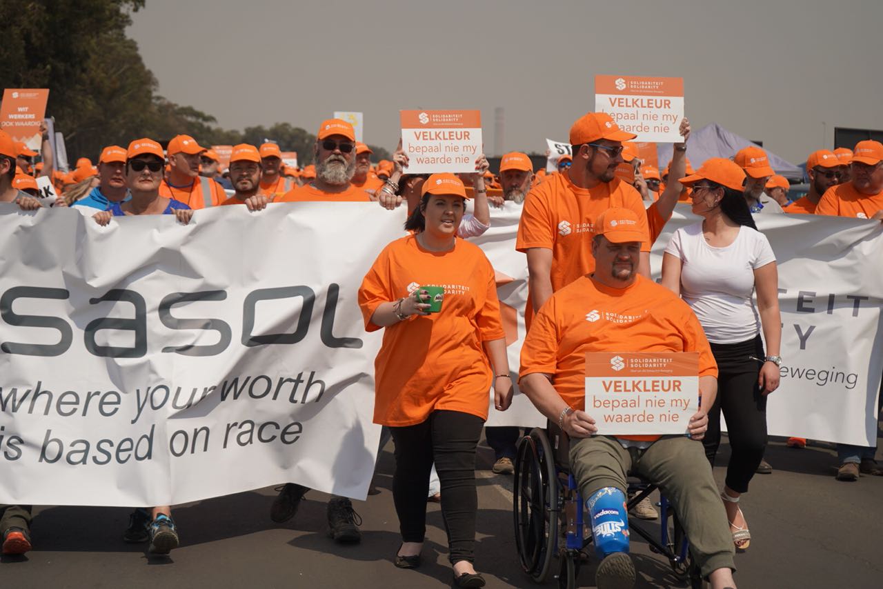 Un trabajador de Sasol afiliado a Solidaridad muestra un cartel con el siguiente mensaje: "El color de la piel no determina mi valor". El Congreso Nacional Africano que gobierna Sudáfrica desde 1994 ha criticado "el trasfondo racista" de la huelga. Sudáfrica dejó atrás en 1994, cuando cayó el régimen de segregación racial del apartheid y se instauró la democracia, un pasado marcado por la discriminación racial contra los negros. Con el objetivo de resarcir a la mayoría antes discriminada, el Congreso Nacional Africano ha aplicado desde su llegada al poder políticas de discriminación positiva que han contribuido al estancamiento económico del país y grupos como Solidaridad denuncian como discriminatorias contra los blancos.